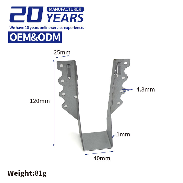 joist hangers support beams and joists, transfer vertical loads, prevent end splits, and reinforce joints for faster assembly and improved structural safety. Our products are precision-stamped from high-quality galvanized steel or stainless steel. We currently offer 25 standard specifications, covering mainstream timber dimensions such as 2×4, 2×6, 2×8, 2×10, and 2×12, with material thickness options of 1mm, 1.2mm, and 2mm, ensuring precise compatibility with various cross-section sizes. These solutions fully meet the installation and renovation requirements of residential housing, light wood framing, and heavy timber structures. In addition, we provide full customization services—including dimensions, material grade, shape, and surface finish—tailored to customers' specific application scenarios.