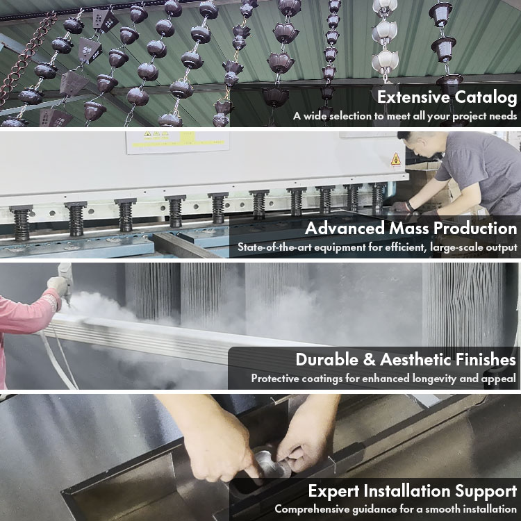 downspouts, drain outlets, end caps, leaf guards, hangers, inside/outside corner, elbows, and pipe clamps. Made of high-quality aluminum coils, aluminum profiles,