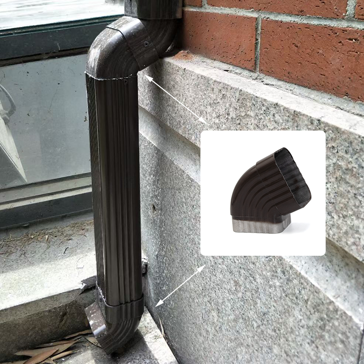 The elbow is designed to change the direction of drainage pipes, adapt to building structural layouts, and ensure the smooth diversion of rainwater. It is widely used in pipe turning scenarios such as downspouts and gutters. It is produced by aluminum die casting with a thickness of 1.5mm, the elbow is available in different angles including 65°, 90° straight bends, and side bends. The customization of materials and dimensions is also provided to meet specific requirements.