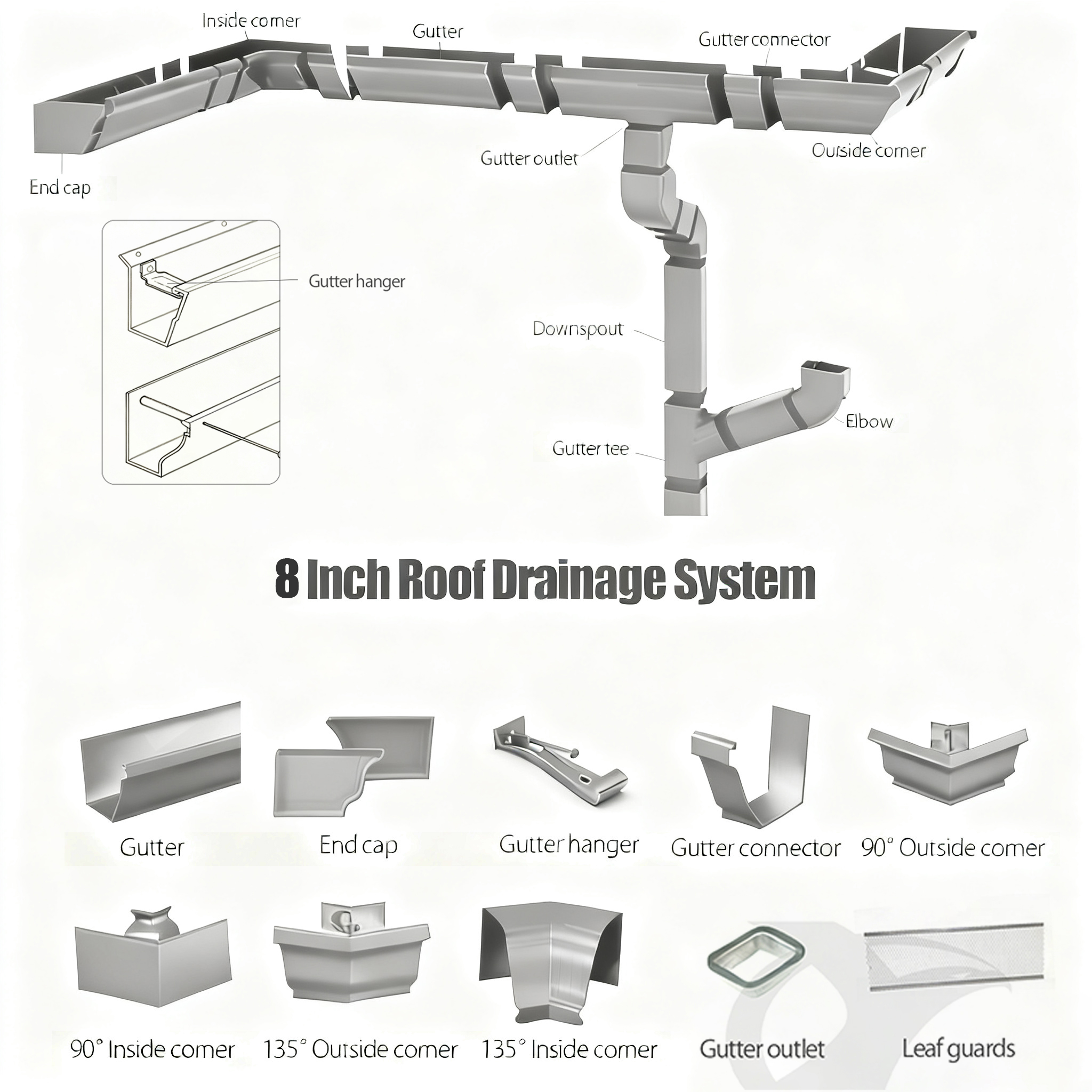 The rainwater drainage series includes complete sets of components such as gutters, downspouts, drain outlets, end caps, leaf guards, hangers, internal/external corners, elbows, and pipe clamps, available in sizes including 5-inch, 6-inch, 7-inch, and 8-inch. Made of high-quality aluminum coils, aluminum profiles, copper, or stainless steel, these products are widely used in various buildings, featuring efficient and stable drainage. They effectively resist rain and snow erosion, protecting building safety. We can provide tailor-made solutions based on your house drawings, ensuring that our products of various materials and sizes perfectly meet the usage needs of different environments in both residential and commercial scenarios.